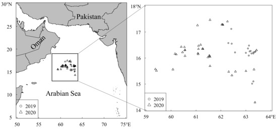 A total of 1177 S. oualaniensis samples were randomly collected from Chinese lighting falling-net vessels “Xinhai 1223” in the northwest Indian Ocean (13°05′–19°45′ N, 61°06–67°50′ E) from February through May 2019, and from February to May 2020 (Figure 1). About 15–30 samples were collected randomly based on the different investigation locations and times. Among them, 514 S. oualaniensis were collected from 20 sampling localities in 2019 and 663 S. oualaniensis were collected from 36 sampling localities in 2020. All squid samples were immediately frozen and later dissected in the laboratory.