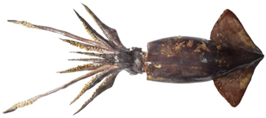 - Jereb, P.; Roper, C.F.E. Cephalopods of the World: An Annotated and Illustrated Catalog of Cephalopod Species Known to Date: Myopsid and Oegopsid Squids; FAO: Rome, Italy, 2010; Volume 2, pp. 315–318. [Google Scholar]