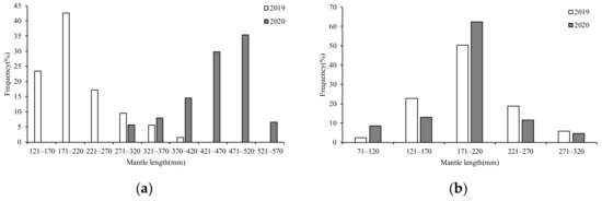 In 2019, the female MLs ranged from 123–356 mm (mean ML: 218.94 mm), with the majority (83.32%) of samples ranging from 121–220 mm. The dominant group ranged from 171–220 mm, accounting for 42.61% (Figure 3a). The male MLs ranged from 98–273 mm (mean ML: 194.83 mm), with the majority (91.89%) of samples ranging from 121–220 mm. The dominant ML group ranged from 471–520 mm, accounting for 35.36% (Figure 3b). In 2020, the female MLs ranged from 279–562 mm (mean ML: 448.36 mm), with the majority (79.74%) of samples ranging from 371–520 mm. The dominant group ranged from 471–520 mm, accounting for 35.36% (Figure 3a). The male MLs ranged from 88–272 mm (mean ML: 188.96 mm), with the majority (86.94%) of samples ranging from 121–270 mm. The dominant ML group ranged from 171–220 mm, accounting for 35.36% (Figure 3b).