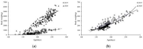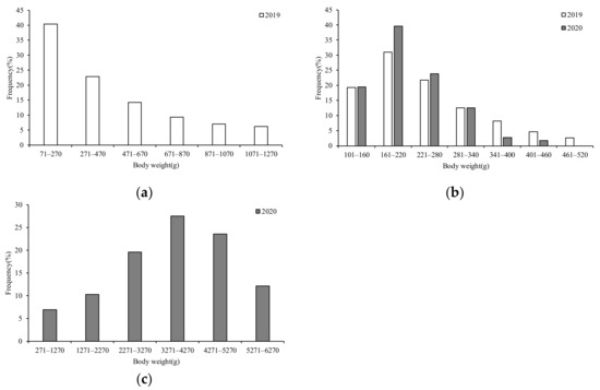 In 2019, the female BWs ranged from 78–1246 g (mean BW: 386.17 g), with the majority (77.51%) of samples ranging from 71–670 g. The dominant group ranged from 71–270 g, accounting for 40.40% (Figure 4a). The male BWs ranged from 82–518 g (mean BW: 229.14 g), with the majority (72.07%) of samples ranging from 101–280 mm. The dominant BW group ranged from 161–220 mm, accounting for 30.96% (Figure 4b). In 2020, the female BWs ranged from 673–6268 g (mean BW: 3375.26 g), with the majority (68.66%) of samples ranging from 2271–5270 g. The dominant group ranged from 3271–4270 g, accounting for 27.54% (Figure 4b). The male BWs ranged from 105–437 g (mean BW: 192.72 g), with the majority (85.94%) of samples ranging from 101–280 g. The dominant BW group ranged from 161–220 g, accounting for 39.63% (Figure 4c).