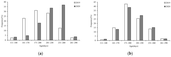 The age composition of the two years of S. oualaniensis was statistically different between the sexes and years. According to the age range of all samples, the 30-d interval described the age classification better. In 2019, the age of females ranged from 113–263 days, with the majority (82.31%) of samples being 141–230 days. The dominant age group ranged from 171–200 days, accounting for 31.13% (Figure 6a). The age range of males ranged from 136–253 days, with the majority (68.59%) of samples being 171–230 days. The dominant age group ranged from 171–200 days, accounting for 42.82% (Figure 6b). In 2020, the age of females ranged from 148–267 days, with the majority (82.31%) of samples being 201–260 days. The dominant age group ranged from 231–260 days, accounting for 36.86% (Figure 6a). The age range of males ranged from 133–229 days, with the majority (68.20%) of samples being 171–230 days. The dominant age group ranged from 171–200 days, accounting for 38.86% (Figure 6b).