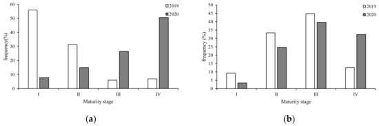 Maturity status differed between sexes were observed in two years of S. oualaniensis samples (Figure 7). In 2019, the majority of females (87.46%) were in stages I and II, while the majority of males (90.72%) were in stages II–IV (Figure 7a,b). In 2020, the majority (77.25%) of female samples were in stages III and IV (Figure 6a), and the majority (71.93%) of male samples were in stages III and IV (Figure 7a,b).