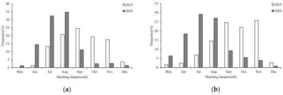 The hatching dates were estimated by combining the age data and sample date. In 2019, the hatching date of females was from May to December 2018, and the peak hatching time was from August to November (Figure 8a). The hatching date of males was from May to December 2018, and the hatching peak was from August to November (Figure 8b). In 2020, the hatching dates of females and males were distributed from May to December 2019, and the hatching peaks were from July to August and June to August, respectively. In general, the hatching date in 2019 was mostly distributed from August to November 2018. The hatching date in 2020 was mostly distributed from June to August 2019. The 2019 samples were mainly composed of the autumn population, while the 2020 samples were mostly composed of the summer population.