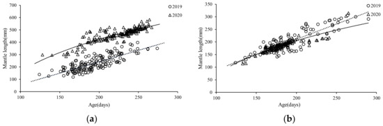 The ANCOVA showed there were significant differences in the ML–age between the sexes of the S. oualaniensis in 2019 (F = 51.94, p = 0.00 < 0.05), and the same result was found in the S. oualaniensis samples in 2020 (F = 4251.99, p = 0.00 < 0.05). Based on the lowest derived AIC value (Table 1), the ML–age relationship of females and males for the autumn population (2019) was best described by a linear growth model (Figure 9a,b), while the ML–age relationship of females and males for the summer population (2020) was best described by a logarithmic growth model (Figure 9a,b).