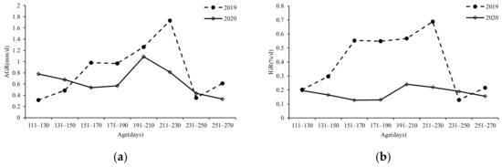 The results showed that both the summer and autumn populations grew rapidly. The maximum AGR (Figure 11a) and IGR (Figure 11b) values for ML of the autumn population (2019) were 1. 73 mm/d and 0.18%/d, respectively, within 191–210 days of age. The maximum AGR (Figure 11a) and IGR (Figure 11b) values for ML of the summer population (2020) were 1.09 mm/d and 0.24%/d, respectively, within 191–210 days of age. The average AGR and IGR for ML of the 2019 samples were 0.85 mm/d and 0.40%/d, respectively, and the average AGR and IGR of the 2020 samples were 0.65 mm/d and 0.18%/d, respectively. The growth of S. oualaniensis samples in 2019 was faster than that in 2020.