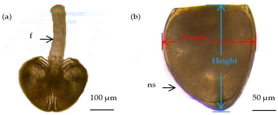 Thirty freshly transformed juveniles were randomly collected from each host fish species at 09:00–10:00 during the peak release period (day 6 after parasitism). In contrast to the glochidium, the freshly transformed juvenile had a free-moving foot (Figure 1a) and formed new transparent shells along its ventrolateral edge (Figure 1b). The juveniles were immediately fixed in 95% ethanol to avoid morphometry being disturbed by movement. The fixed samples were photographed using an Olympus BX51 microscope (Olympus Co., Tokyo, Japan) at 200× magnification. Shell length and height (Figure 1b) were measured using built-in Olympus measurement software. With reference to the method used to calculate the glochidia index [], the juvenile index (JI, mm2) was attempted to calculate to compare the size of freshly transformed juveniles released from different host fish species:
