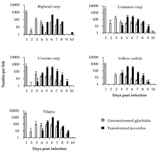 Developmental dynamics of Anodonta woodiana glochidia on the five host fish species. Bars represent the mean ± SD of the number of untransformed (white bars) and transformed (black bars) juveniles recovered per host fish on each day after infection.