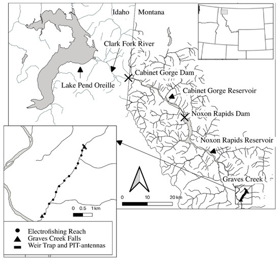 Graves Creek enters the north side of Noxon Reservoir as a fourth order stream with a length of about 21 km. Graves Creek Falls is a natural barrier to upstream fish passage located at river kilometer 5.2, and bull trout distribution is limited to below the falls (Figure 1). Despite the small area of habitat occupied by bull trout, Graves Creek has consistently contributed a large proportion of transports to the downstream trap-and-haul program (i.e., juvenile bull trout that are captured out-migrating and transported into Lake Pend Oreille) [20]. Bull trout and westslope cutthroat trout Oncorhynchus clarkii lewisi, are the most predominant species present below Graves Creek Falls [28]. The habitat in Graves Creek below Graves Creek Falls is primarily classified as pool–riffle stream type, with small sections of higher gradient step-pools [29]. The Graves Creek watershed is encompassed by a mix of private and public land ownership [29].