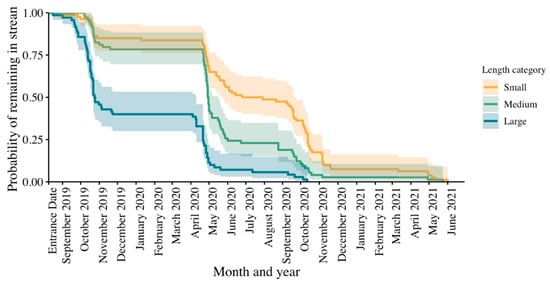 Probability of remaining in Graves Creek, Montana, for juvenile bull trout from the 2019 year-class, with colors delineating three size categories based on the length at time of summer electrofishing, small (TL (mm): 105–111, n = 6), medium (TL (mm): 111–116, n = 7), large (TL (mm): 116–129, n = 8), and associated 95% confidence interval.