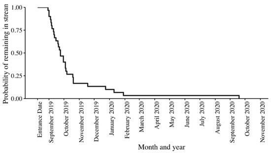 None of the categories for any variable (i.e., length, condition) predicted time to out-migration for juvenile bull trout from the 2017 year-class that were initially encountered at age 2 (n = 30) (length [log-rank test: c2 = 0.1, df = 2, p = 0.97], condition [log-rank test: c2 = 0.2, df = 2, p = 0.92]). The median time-to-out-migration for bull trout from the 2017 year-class was 46 days (Figure 5).