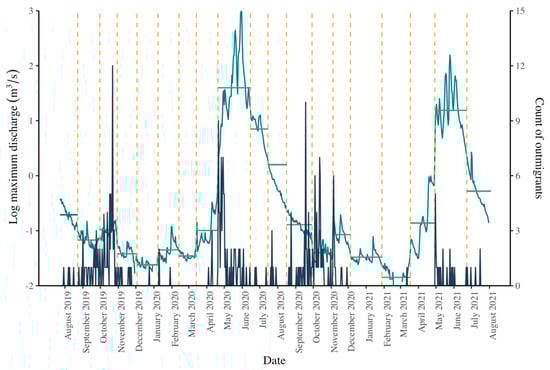 Time series from Graves Creek, Montana, from 25 July 2019 through 1 August 2021, with light blue lines delineating time series of natural log-maximum daily discharge (cubic meters per second; m3/s) and dark blue lines delineating time series of bull trout out-migrating by day. Dotted yellow lines delineate changepoints, and green horizontal lines represent the mean for each segment between the changepoints.
