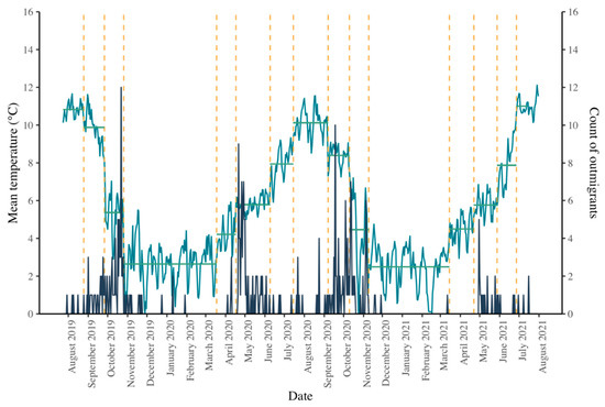 Time series from Graves Creek, Montana, from 25 July 2019 through 1 August 2021, with the light blue line delineating time series of mean daily water temperature (°C) and the dark blue line delineating time series of bull trout out-migrating by day. Dotted yellow lines delineate changepoints, and horizontal green lines represent the mean for each segment between the changepoints.
