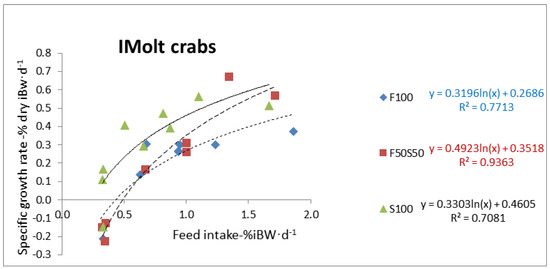 (ii) For the IMolt crab group, as FCE was significantly higher in diet S100, two polynomial equations were defined: one for diet S100 treatment and one by pooling data (n = 14) for diets F100 and F50S50.