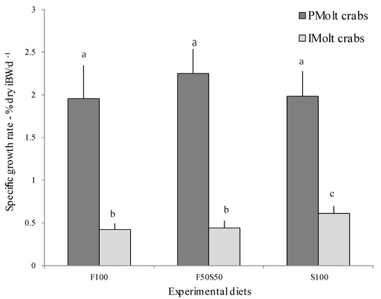 Adjusted mean specific growth rates (± SD) for average feed intakes of PMolt and IMolt crabs. Means with different superscript letters differ significantly (p < 0.05).