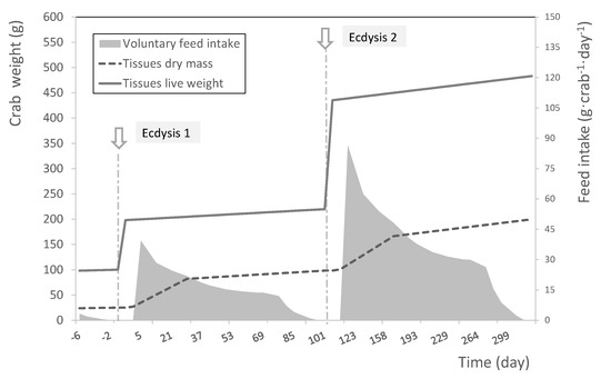 Most of the previous studies have considered the growth rate as gains in fresh weight. However, fresh weight changes follow a basic pattern through the molt cycle, i.e., large and abrupt increases associated with rapid water uptake at ecdysis; further moderate gains associated with carapace mineralization and tissue growth during postmolt; and the relative stabilization of fresh weight during intermolt until the onset of the successive ecdysis [10]. An increase in tissue mass, on the other hand, is a continuing process occurring through the molt cycle [9,11]. Tissue growth can be measured as the increase in dry mass of the animal; this measure is more relevant than live mass, which is subject to the extremely variable water content of the molting cycle in crustaceans [9,12].