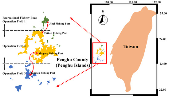 It is precisely because the government has promoted the fishery transformation policy, the citizens’ economic level is being gradually improved, the fishery resources in the coastal waters are progressively decreasing, and the public now attaches great importance to the sustainable development of marine resources, etc., that the recreational fishery trend has arisen [8]. The recreational fishery is a recreational activity that combines fishing and ecological tourism [18] and is regulated by the Fisheries Law of the Council of Agriculture of the Executive Yuan, the Regulations for Recreational Fishery and the Law of Ships of the Maritime Port Bureau, MOTC.