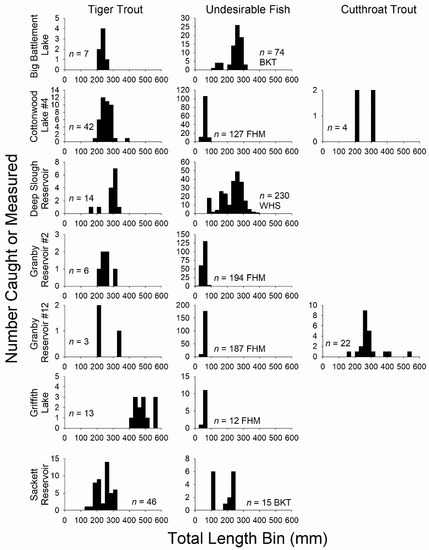 - Winters, L.K.; Budy, P.; Thiede, G.P. Earning their stripes: The potential of tiger trout and other salmonids as biological controls of forage fishes in a western reservoir. N. Am. J. Fish. Manag. 2017, 37, 380–394. [Google Scholar] [CrossRef]