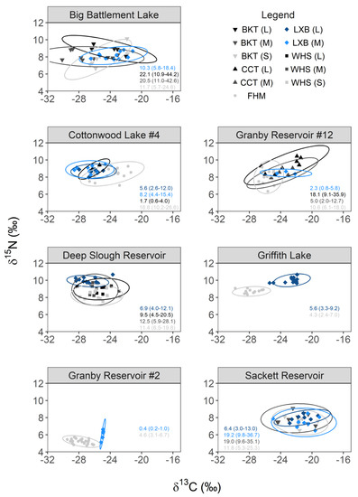 Bi−plot of δ13C and δ15N values (points) for each individual of each species and size-group of fish sampled from each study system. Lines represent corresponding 95% prediction ellipses used to compute trophic niche space (‰2; values on each panel) and trophic niche overlap among species and size-groups within the same system. In some instances, size-groups of fish needed to be combined to meet minimum sample size requirements for computing trophic niche overlap. Medium (M; 150−249 mm TL; n = 10) and large (L; ≥250 mm TL; n = 1) tiger trout (LXB) in Big Battlement Lake were combined, but coded as medium-sized fish as these were the majority. Medium (n = 2) and large (n = 2) cutthroat trout (CCT) were combined in Cottonwood Lake #4, but since medium fish were close in size to large fish, they were all coded as large. Medium (n = 2) and large (n = 12) tiger trout in Deep Slough Reservoir were combined and coded as large-sized fish as these were the majority. Medium (n = 3) and large (n = 2) tiger trout in Granby Reservoir #2 were combined, but coded as medium-sized fish as these were the majority. Medium (n = 2) and large (n = 1) tiger trout in Granby Reservoir #12 were combined, but coded as medium-sized fish as these were the majority. Lastly, small (n = 1) and medium (n = 6) tiger trout were combined in Sackett Reservoir, but coded as medium-sized fish as these were the majority.
