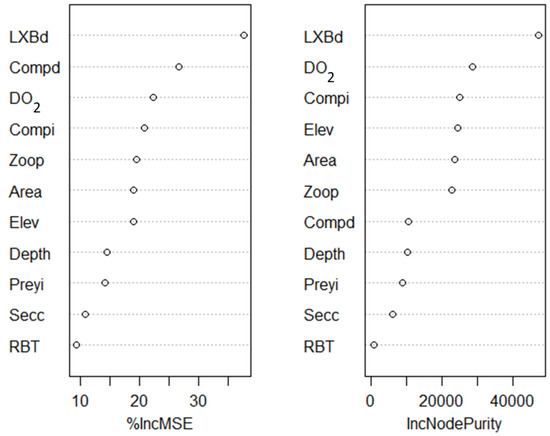 Importance metrics for different variables considered as potential predictors of early tiger trout growth in the Random Forest Model. Predictor variables are ranked for relative importance (top-to-bottom) according to their percent increase in mean square error if removed from the model (%IncMSE; left panel) and in node purity (IncNodePurity; right panel). Predictors included surface area (Area; ha), maximum depth (Depth; m), elevation (Elev; m), dissolved oxygen (DO2; % of water column with DO ≤2.0 mg/L), an integrative index of food web structure and early food supply (Zoop; mean biomass density of zooplankton [g dry weight/m2]), cohort-specific tiger trout stocking density (LXBd; number/ha), an index of interspecific competition (Compd: stocking density [number/ha] of other salmonid sport fish in the same year as tiger trout), a field-based index of interspecific competition (Compi: catch rates [number fish/hour] of non-tiger trout in gill nets during 2017), a legacy index of stocking large salmonid sport fish (RBT; presence or absence of stocking ≥ 225 mm fish in recent history), and an index of prey fish availability (Preyi; number fish/hour of non-tiger trout captured additively in micro-mesh gill nets and miniature trap nets during 2017).