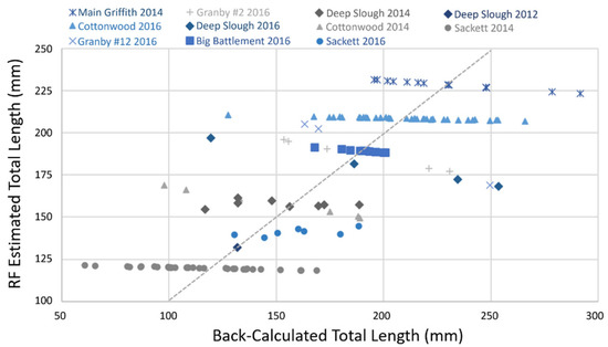 Predicted (from Random Forest model; RF) versus observed back-calculated TLs-at-first-annulus for individuals from each cohort (years) of tiger trout sampled from each study system.