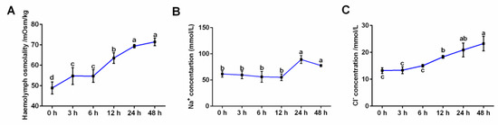 - Cheng, W.; Yeh, S.-P.; Wang, C.-S.; Chen, J.-C. Osmotic and ionic changes in Taiwan abalone Haliotis diversicolor supertexta at different salinity levels. Aquaculture 2002, 203, 349–357. [Google Scholar] [CrossRef]