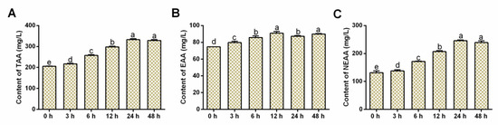 | Tyrosine | 5.19 ± 0.45 c | 5.02 ± 0.53 c | 5.67 ± 0.44 c | 7.21 ± 1.20 b | 5.28 ± 0.20 c | 11.18 ± 0.48 a |