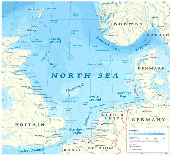 - Map of the North Sea. Available online: https://commons.wikimedia.org/wiki/File:North_Sea_map-en.png (accessed on 21 November 2022).