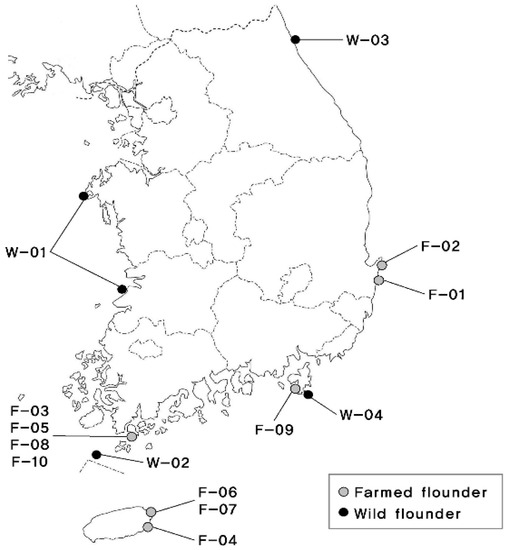 A total of 1876 olive flounder were selected as initial population for breeding in 2003–2004 from 4 wild populations and 5 farms. Geographic locations and nomenclature are shown in Figure 1. Rotifers were used to feed fish from 3 to 20 days of age after hatching, Artemia was used until 31 days of age after hatching, and extruded pellets were used until harvest. During production, the water temperature ranged from 13.7 to 27.3 °C, salinity ranged from 30.7 to 34.8 psu, and dissolved oxygen (DO) ranged from 7.0 to 11.5 mg/L.