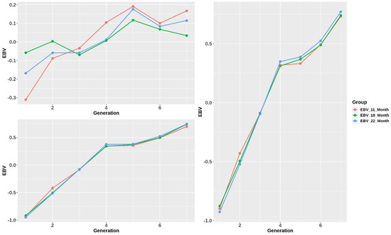 After 7 generations of selection, the EBV of BW increased (Figure 4), and, as expected, BW at the harvest stage increased by approximately 13%, showing the success of selection. Response to selection was highly dependent on heritability. In our study, the heritability of the BW trait at the early stage (11 months), which was 0.449 0.019, was found to be higher than at later stages, which were 0.358 0.019 and 0.365 0.020. Li et al. [4] showed that the closer to the harvest stage, the lower the heritability of BW. Many other studies in China also agreed with this trend. Liu et al.’s study [21] using the same animal model showed that the heritability of BW dropped from 0.72 at 180 days of age to 0.47 at 360 days of age, which was slightly higher than our result in the same period. From our point of view, this decrease in heritability was due to the larger influence of environmental effects on growth performance over time than genetic ones. Interestingly, although heritability declined over the lifetime, in our study, estimated breeding values of BW in three stages were not significantly different in all generations. This could be because the environmental factors were stable, aiding the efficiency and accuracy of selection, which can be observed in the rapid increase of EBV of BW through 7 generations.