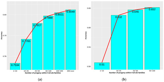 The accuracy of breeding value prediction is affected by several factors. In this study, the effect of the number of progeny in a full-sib family was studied to determine the optimal number for the breeding strategy. Figure 5a shows general accuracy calculated from all the information on 7 generations. A clear improvement in accuracy was observed when increasing the number of progeny within a full-sib family. The higher the number of progeny, the higher the accuracy. The accuracy increased rapidly from 0.753 to 0.800 when the number of progeny grew from 1–10 to 50–100. The growth became slower in a larger family. Figure 5b demonstrates the accuracy of parent EBV prediction based on the information concerning each family. In general, accuracy in case B was significantly lower than in case A. The biggest difference was in family size 1–10 progeny, which reduced accuracy from 0.75 to 0.51. This difference decreased sharply (by 0.14) after increasing the family size to 10–25 progeny and changed negligibly until reaching a family size of 50–100 progeny.