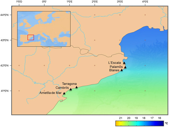 Map of the Catalan Coast in the western Mediterranean Sea showing sea surface temperature (SST, °C) to delimit thermal regimes and the fishing harbours where Sardina pilchardus was caught (FAO-GFCM geographical subarea GSA-06, Northern Spain). Along the northern coast, the locations of l’Escala, Palamós and Blanes are indicated; on the southern coast are the locations of Tarragona, Cambrils and Ametlla de Mar. Temperature (°C) was retrieved monthly from HadISST sea surface temperature time series (1900–2020) for the period 2019–2020 (https://www.metoffice.gov.uk/hadobs/hadisst/ (accessed on 22 February 2022 )).