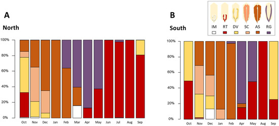 Significant differences were obtained in the monthly relative frequency of gonad developmental phases between the two thermal regime areas in October (p = 0.007), December (p = 0.006), January (p = 0.001), February (p = 0.000), August (p = 0.000) and September (p = 0.000) (Figure 2). Regarding the onset of the spawning season, actively spawning (AS) sardines appeared in October and lasted until March on the northern coast (Figure 2A). By contrast, on the southern coast, AS sardines were found from later in November until April (Figure 2B). The main spawning peak occurred in January in the north (73.3% AS) and a month later in the south (73% AS). Individuals in the regressing (RG) stage started to appear progressively, first at a low percentage during February in the north (9%) and in the south (2%). Regeneration (RT) of the gonads started in April on both coasts. Sardines in the developing stage DV appeared in September on the northern and southern coasts (10.6% and 33.6%, respectively), and were found until December in both areas.