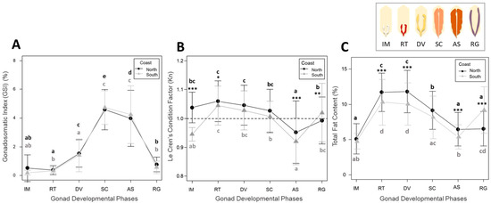 (A–C) The gonadosomatic index (GSI) (%), Le Cren’s condition factor (Kn), and total fat content during the annual reproductive cycle, comparing sardines caught on the northern Catalan Coast with the ones caught on the southern Catalan Coast. Gonad developmental phases: IM, immature; RT, regenerating; DV, developing; SC, spawning capable; AS, actively spawning; RG, regressing. Significance values were indicated as follows: p < 0.05 *; p < 0.001 **; p < 0.0001 ***. Lowercase letters indicate differences in GSI, Kn and total fat content throughout the gonad developmental phases.