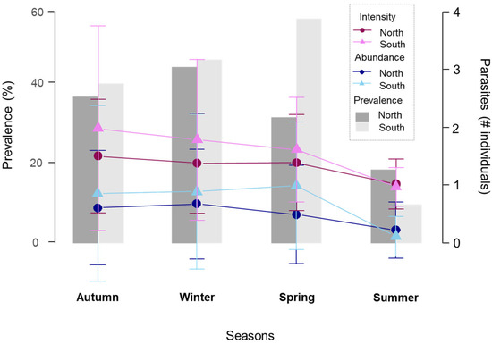 Differences (p = 0.000) in the annual nematode parasite prevalence were observed in sardines distributed along the Catalan Coast (Figure 4). Two different parasitic infection patterns were observed. In the north, sardines captured in winter presented the highest parasite prevalence, followed by sardines sampled in autumn and spring (data in Table 3). In contrast, a higher prevalence in the south was detected in spring, followed by winter and autumn. Nevertheless, summer was the season with lower presence of nematodes for both locations. By comparing sampling locations, significant differences in parasite prevalence were observed during spring (p = 0.000), and no annual variation of parasite mean intensity was detected in sardines from the Catalan Coast. Values shown in Table 3 suggested that sardines were more heavily infected (regarding mean intensity) in autumn-winter and less infected during the summer. Differences between sampling areas in mean intensity and abundance of parasites were detected in winter (p = 0.029) and spring (p = 0.002), respectively, with significantly higher values in the south.