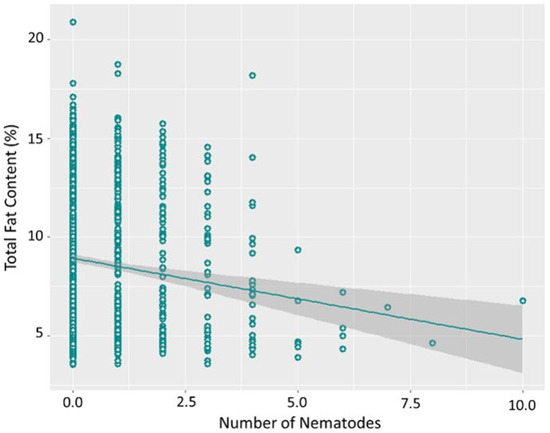 Correlation between total fat content (%) and the number of nematodes infecting sardines on the Catalan Coast.