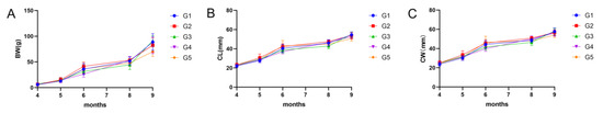 Growth performance of Eriocheir sinensis with different stocking densities. (A) Body weight (BW); (B) carapace length (CL); (C) carapace width (CW). G1: 1.2 inds/m2; G2: 1.5 inds/m2; G3: 1.8 inds/m2; G4: 2.1 inds/m2; G5: 2.4 inds/m2. Data are presented as mean ± standard deviation (SD) (n = 30).