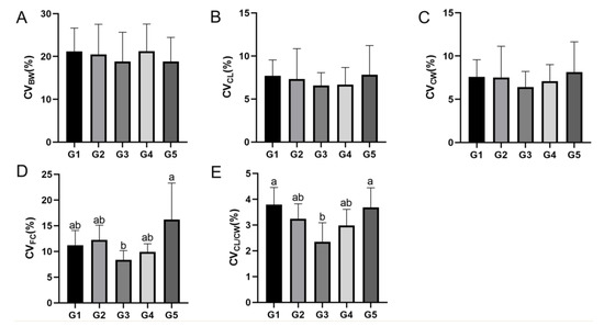 As shown in Figure 1, BW, CL, and CW of E. sinensis in each group increased with breeding time, and the BW of E. sinensis in the G3 group was higher than that in the G1, G2, G4, and G5 groups after 169 days of breeding. WGR and SGR in the G1 group were both significantly higher than those in the G4 and G5 groups (p < 0.05). GRCL and GRCW in the G1 group were higher than those in the G2–G5 groups (p > 0.05). The CW/CL value in all groups was in the range of 1.07–1.08, and the CF value was significantly higher in the G3 group than in the G2 and G5 groups (p < 0.05) (Table 5). In addition, CVBW in the G4 group was higher than that in G1, G2, G3, and G5 groups (Figure 2A), and CVCL and CVCW in the G5 group were higher than those in the G1–G4 groups (Figure 2B,C). CVCF in the G5 group was significantly higher than that in the G3 group (p < 0.05; Figure 2D), and CVCW/CL in the G1 group was significantly higher than that in the G3 group (p < 0.05; Figure 2E).