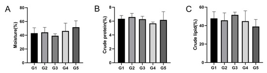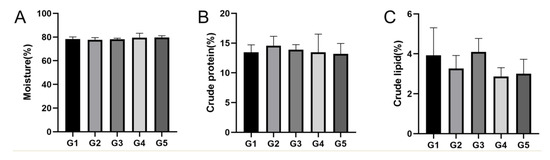 In the muscle and hepatopancreas tissues, the moisture content in the G5 group was higher than that in the G1–G4 groups (p > 0.05), crude protein content in the G2 group was higher than that in the G1 and G3–G5 groups (p > 0.05), and crude lipid content in the G3 group was higher than that in the G1, G2, G4, and G5 groups (p > 0.05) (Figure 3; Figure 4).