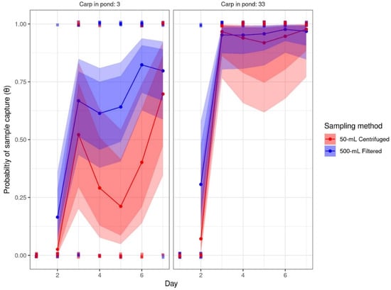 Probability of sample capture (Θ) over time. The probability of capturing Grass Carp eDNA within a sample is modeled for each pond using occupancy modeling with 80% credible intervals shown by dark shading and 95% credible intervals shown by light shading. Square points represent individual samples jittered around 0 (did not capture target eDNA) or 1 (did capture target eDNA). Points are jittered randomly to avoid overlap using ggplot2 [71]. The data are color coded by which sampling method was used: red = 50-mL Centrifuged, blue = 500-mL Filtered.