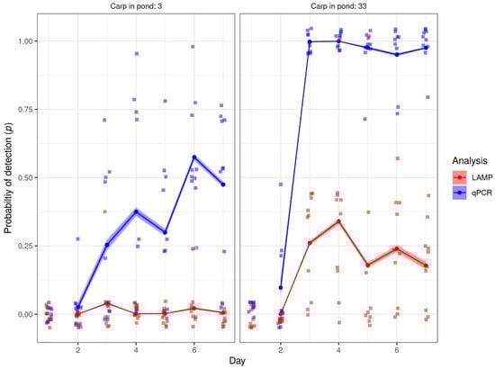 Probability of detection (p) grass carp eDNA by LAMP and qPCR over time. The probability of detection within an analytical replicate is modeled for each pond using occupancy modeling with 80% credible intervals shown in dark shading and 95% credible intervals shown in light shading. Square points represent the positivity rate for individual samples jittered around the observed values (0, 0.2, 0.4, 0.6, 0.8, or 1 for LAMP and 0, 0.25, 0.5, 0.75, or 1 for qPCR). The data are color coded by analytical method used: red = LAMP, blue = qPCR.