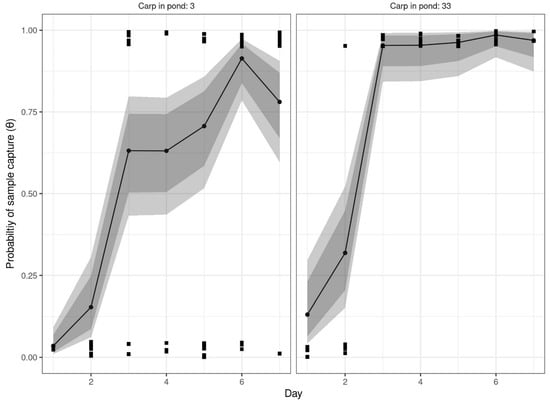 First, we fit a model to compare the two different sampling methods: 50-mL centrifuged and 500-mL filtered. This comparison was only done with samples processed using the qPCR assay. For this comparison, we estimated sample capture probabilities (θ) for each day, fish stocking density, and sampling method combination (e.g., Day 1, fish stocking density of 3 carp, and the 50-mL). We estimated the molecular detection probability for qPCR for each day of sampling and estimated θ for each day. Comparing the estimates for θ allowed us to compare the effectiveness of the different extraction methods. For this model, we estimated a molecular detection probability p for each day and stocking combination.