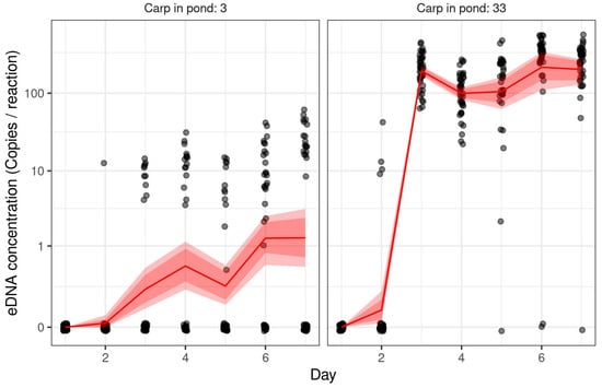 For visualizing the eDNA concentration, we calculated means for each pond by day from the qPCR data using the best estimates we obtained for values below the LOQ. We determined the 95% and 80% credible intervals using a basic nonparametric bootstrap with 1000 resamples.