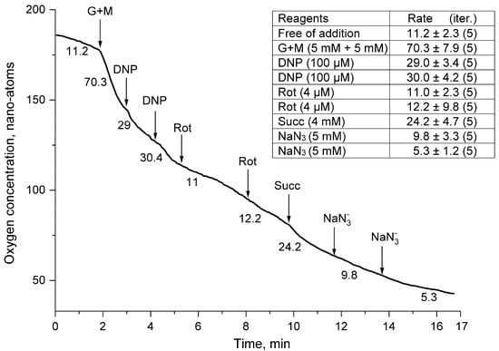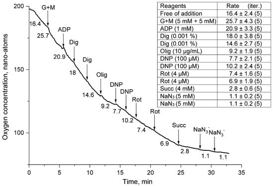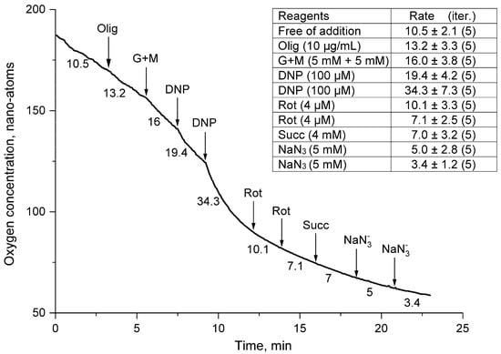 12]. These substrates increase the flow of protons and electrons in mitochondria and thus stimulate their respiratory activity. Oligomycin (Olig), digitonin (Dig), dinitrophenol (DNF), rotenone (Rot), sodium azide (NaN
