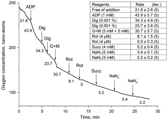 Figure 4). After the stimulation of respiration of a cell suspension of thornback ray erythrocytes by the addition of ADP, the permeabilization of the plasma membrane of erythrocytes with digitonin (Dig) caused a drop in the respiration rate of the thornback ray cell suspension. The negative impact of permeabilization (Dig) was effectively eliminated by adding a mixture of the energy substrates glutamate + malate (G + M). The activation of cell respiration (G + M), as expected, was completely blocked by rotenone, against which the attempts to “resuscitate” the respiration of the mitochondrial complex of thornback ray erythrocytes with succinate (Succ) were ineffective. The experiment ended with the addition of sodium azide (NaN