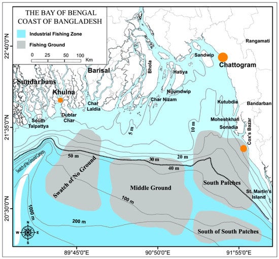 Map of the Bay of Bengal Bangladesh marine waters showing industrial fishing zone beyond 40 m depth contour (deep sky) and the location of sampling sites (brown) [].