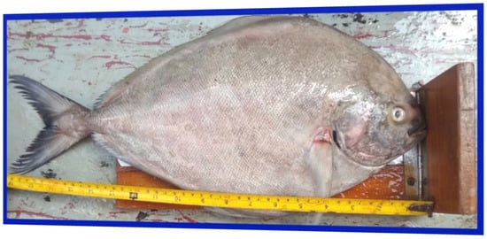 The black pomfret, Parastromateus niger (Bloch, 1795), locally known as ‘Kalo chanda’ is one of the highly valued commercial fish species belonging to the family Carangidae [] with a trophic level of 3.0 (primary carnivore) and inhabits the shallower coastal waters of the Indian Ocean to the Western Pacific Ocean [,]. It is widely distributed in coastal, estuarine, and marine habitats ranging from the depth of 5 to 105 m in the Bay of Bengal, Bangladesh marine waters []. This species is the only known member of its genus. In Bangladesh, black pomfrets are mostly available from November to April, as observed from its mean annual landing [].