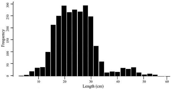For the estimation of fishing mortality, a linearized length-converted catch curve (LCCC) was produced from the length data and growth parameters. Then the instantaneous mortality rate (Z) was calculated from the slope of the regression line of the descending part of the catch curve []. The natural mortality (M) was then calculated using the following formula proposed by Then et al. (2015) []: