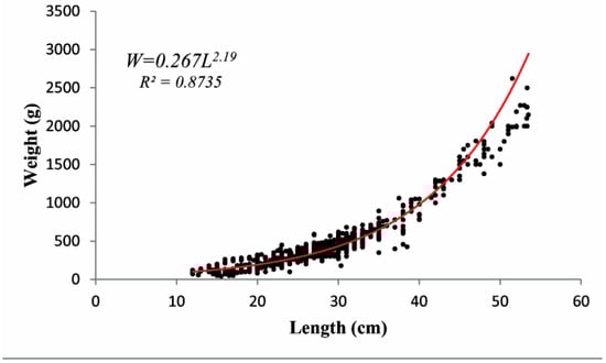 This model is often referred to as an allometric growth model. The length-weight parameters ‘a’ and ‘b’ were estimated using the following equation []: