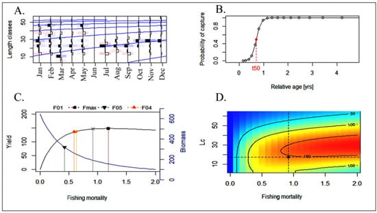 The calculated value of total mortality (Z) based on a linearized length converted catch curve using TropFishR is 1.61 year−1. The natural mortality rate (M) was calculated as 0.69 year−1 by the method introduced by Then et al. (2015) []. The fishing mortality rate was estimated as 0.91 by subtracting M from Z. The biological reference points of fishing mortality and exploitation were then estimated and summarized in Table 2. The graphical outputs of the catch curve and YPR model are illustrated in Figure 5B–D. The calculated present fishing mortality (Fcurrent = 0.91) maintains a reasonable distance between the maximum reference fishing mortality (Fmax = 1.30 year−1) and proxy Fmsy (F0.1 = 0.63). The estimated present exploitation rate (Ecurrent = 0.56) is higher than threshold Eopt = 0.5 [], and less than the maximum estimated exploitation (Emax = 0.73), indicating overexploitation is going on over the stock. Under the present level of gear selectivity when the total mortality (Z) is 1.61 year−1, the mean length at first capture (Lc) was calculated as 17.52 cm, and 22.95 cm refers to this length class has a 50% and 95% respective probability of being captured. Maximum yield could be obtained from the YPR model when the Fmax and Emax values are at 1.18 year−1 and 0.73, respectively. Half of the stock biomass likewise could be obtained as the annual yield when F0.5 and E0.5 are at 0.42 year−1 and 0.26 year−1, respectively. The biologically optimum yield could be obtained when F0.1 = 0.63 year−1 and E0.1 = 0.39, respectively. The mean stock biomass was calculated as 1800 mt, where the mean weight of matured individuals was estimated as 519 gm.