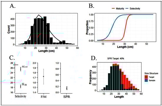 The result of the LB-SPR model shows: (A) length–frequency distribution of the observed fished population, and the solid black line show the predicted fished size composition from the fitted LB-SPR model; (B) maturity and selectivity curve from the fitted LB-SPR model when L50% = 30.63 cm and L95% = 33.70 cm; (C) shows the distribution of mean selectivity parameters (SL50% and SL95%), fishing mortality to natural mortality (F/M), and spawning potential ratio, SPR; (D) observed size data against an expected size composition at a target SPR (0.4).